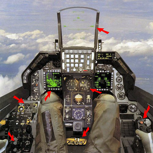 van de cockpit van de F-16 Fighting Falcon kijkt, dan zie je een heleboel